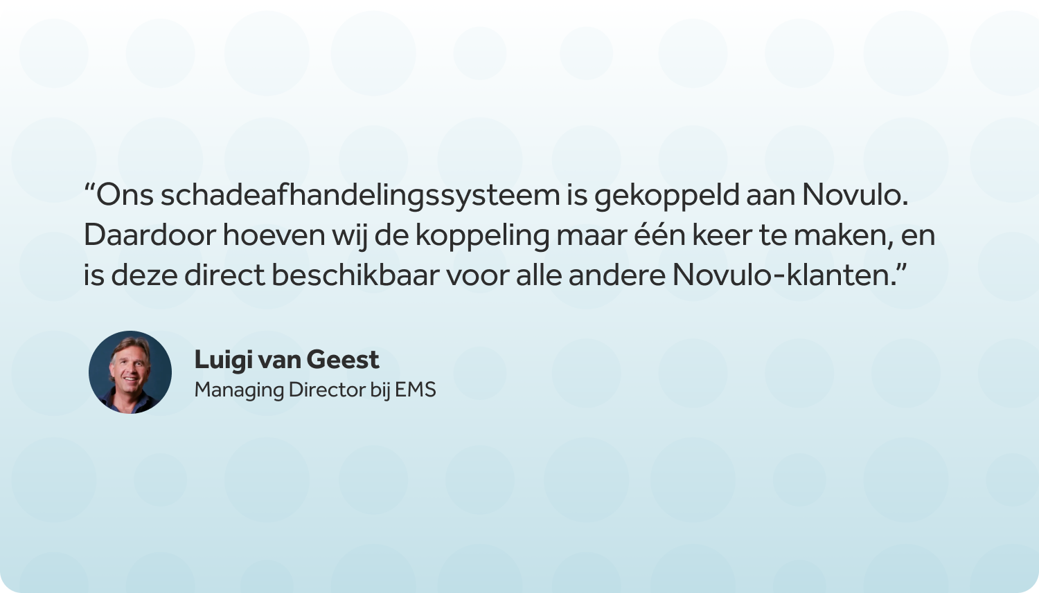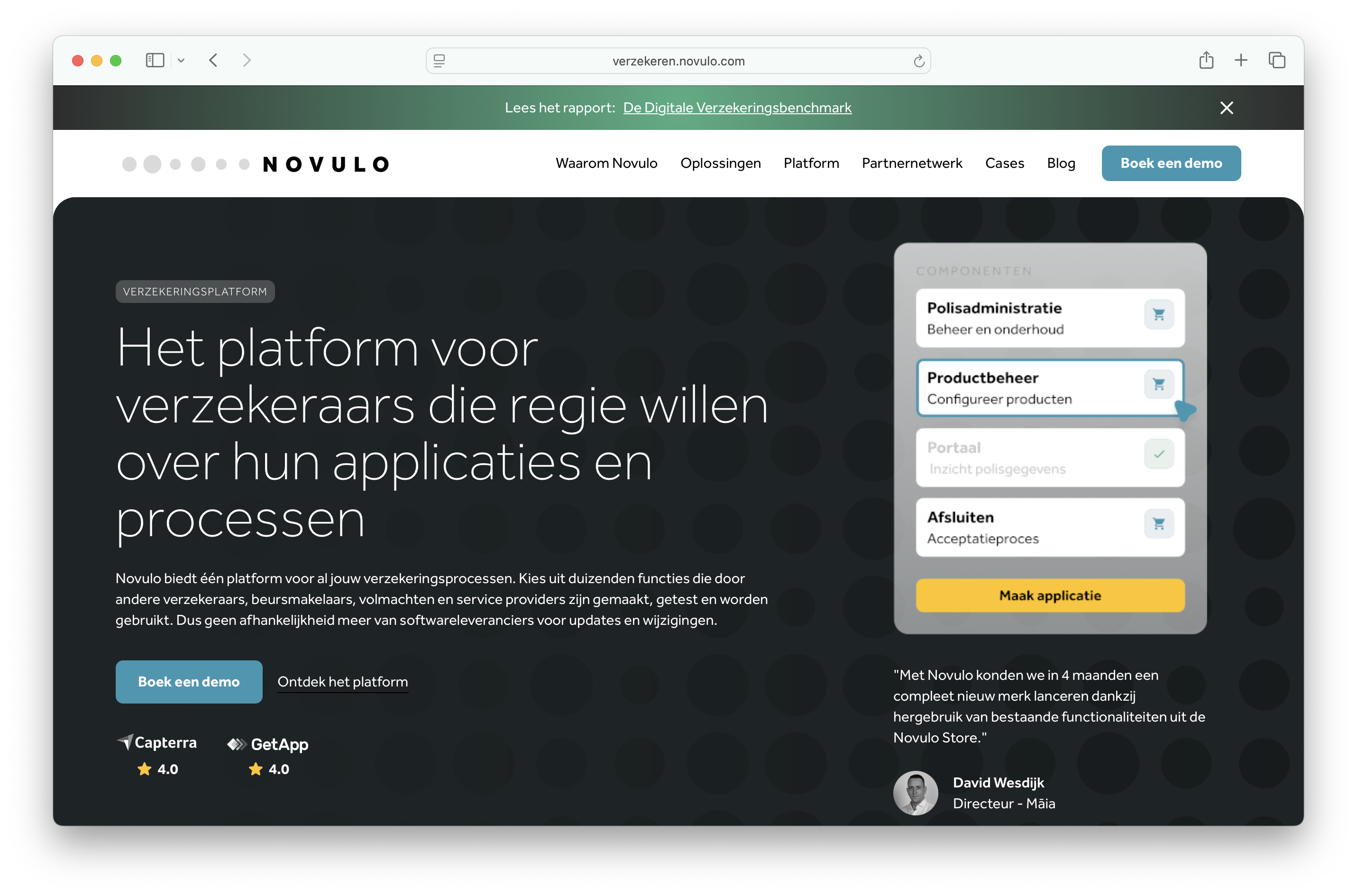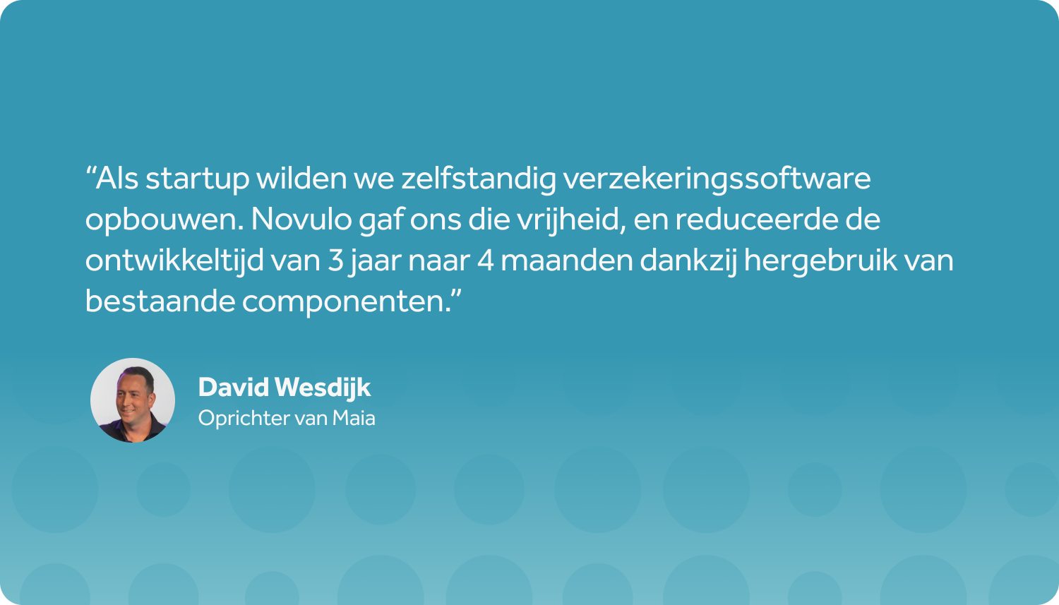 Novulo: werkt volgens een composable aanpak. Verzekeraars, volmachten en intermediairs kunnen applicaties zelf samenstellen met kant-en-klare componenten, die eenvoudig te configureren zijn zonder maatwerk. Dankzij deze gestandaardiseerde basis kunnen zij flexibel blijven en sneller uitbreiden zonder migraties.
