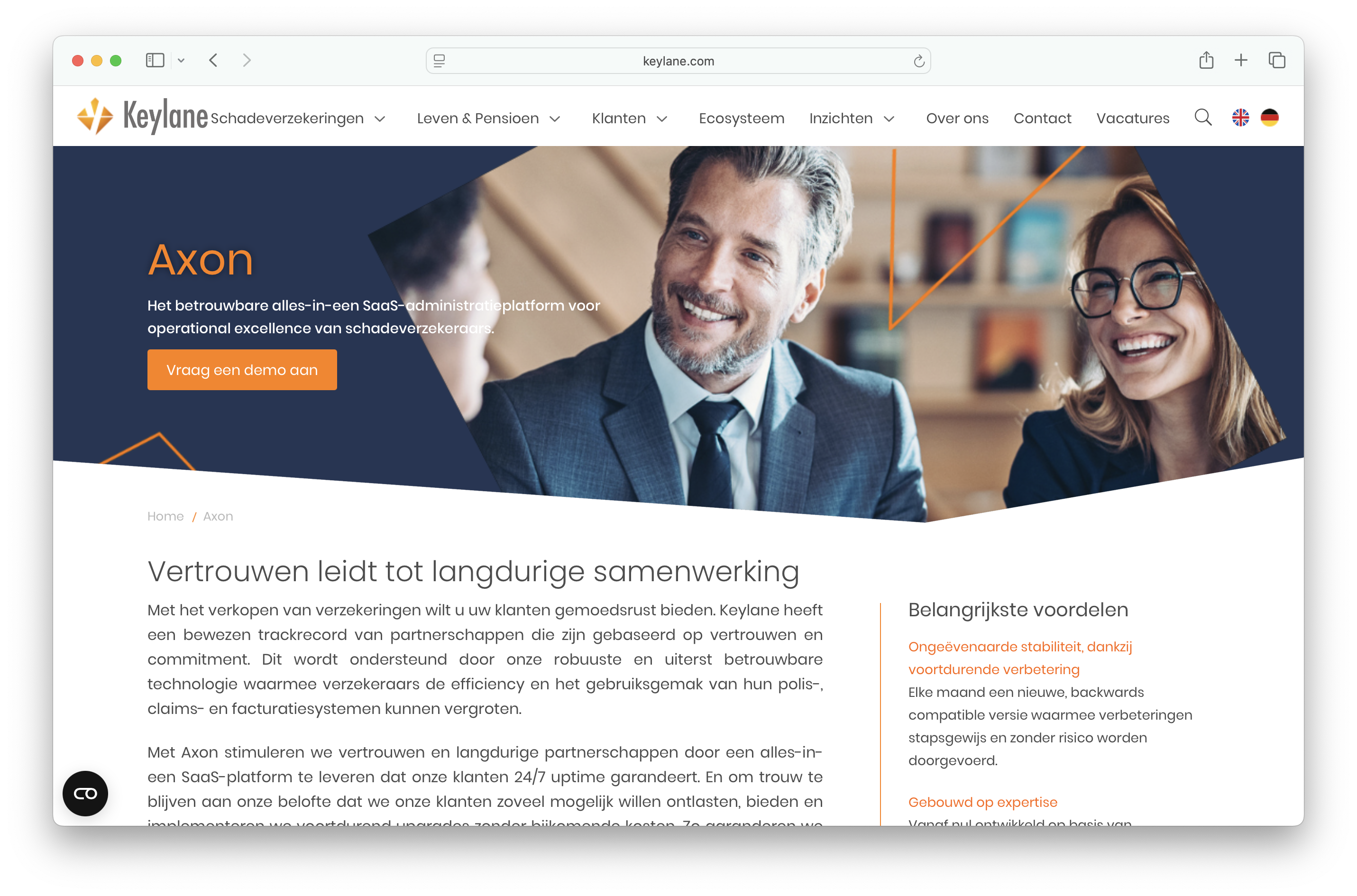 Keylane biedt met Axon een cloud-native SaaS platform dat zich richt op schadeverzekeraars in de EMEA-regio. Het platform is ontwikkeld om standaardisatie en schaalbaarheid te bieden, vooral voor grotere verzekeraars.